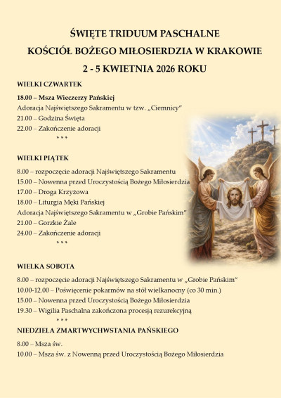 - w sobotę 4 kwietnia, adoracja Najświętszego Sakramentu w „Grobie Pańskim” rozpocznie się o godz. 8.00. Od 10.00 do 12.00, co 30 minut, poświęcenie pokarmów na stół wielkanocny. O godz. 15.00 Nowenna przed Uroczystością Bożego Miłosierdzia. O godz. 19.30 rozpoczniemy obchody Wigilii Paschalnej, które zakończy procesja rezurekcyjna. Na liturgię Wielkiej Soboty należy zabrać świece.